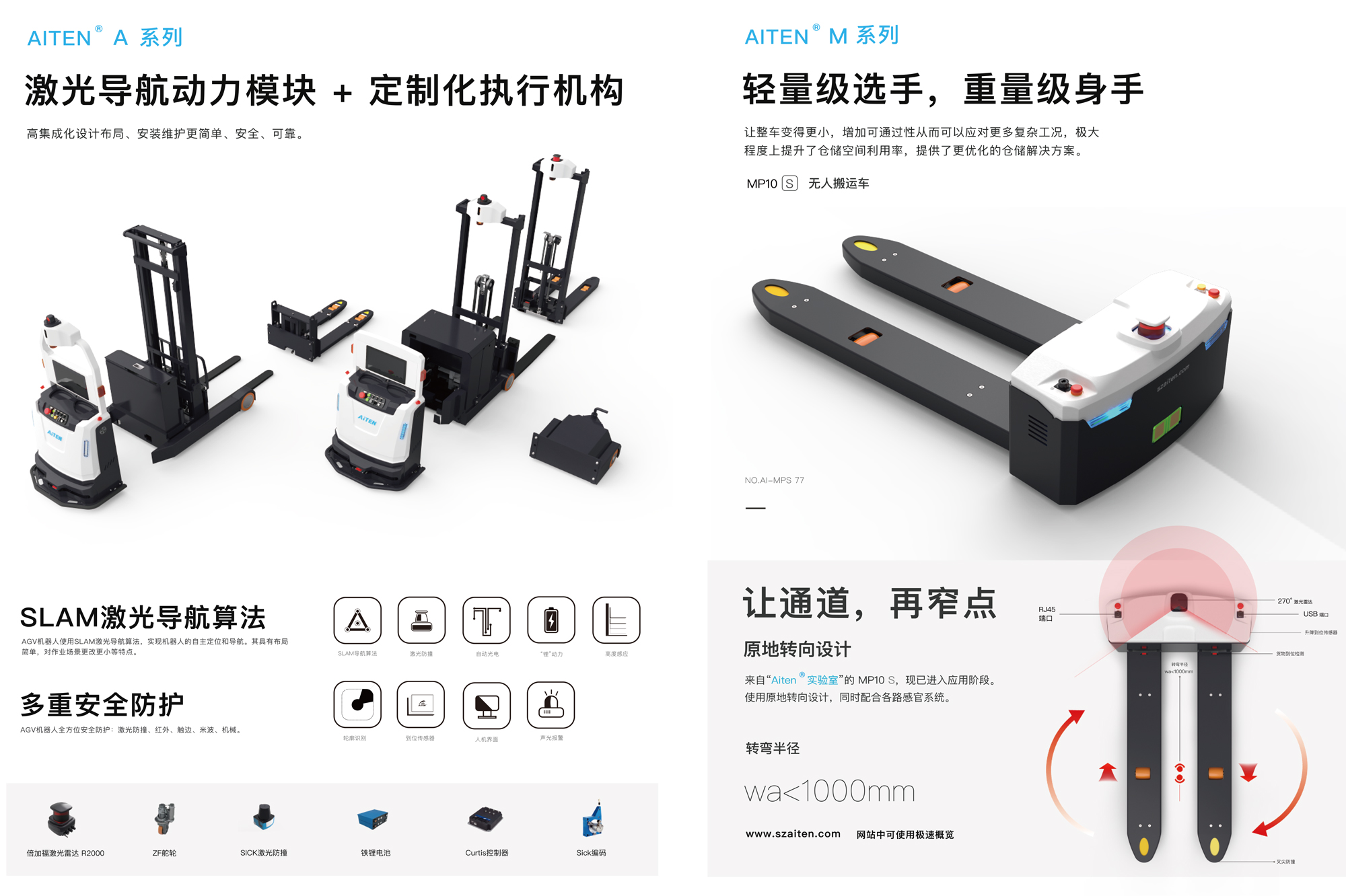 其中,海豚之星AGV无人叉车在行业内的知名度虽小,但其主打产品M系列小海豚——MP10S受欢迎程度只增不减,其使用的导航方式有磁导航、激光导航等,可以在狭窄的通道里原地360°自由转向、行驶,车身配有手动操作控制器,既可以人工操作行驶,也可以根据计算机软件控制运行路径,操作方便、简单,且外表美观。海豚之星AGV无人叉车的A系列产品亦是,拥有激光导航的动力模块,加上定制化执行机构,高度集成化的设计布局,具有安装维护简单、快捷、安全、可靠性高等优势。